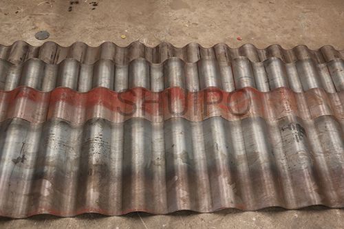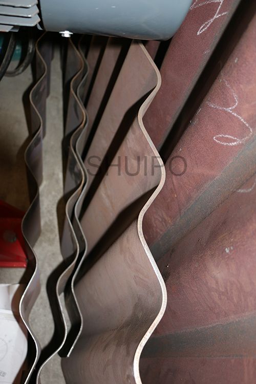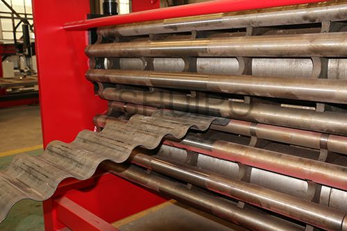 波纹板成型机主要分为机架、驱动部分、上压轮、下压轮、进料导向机构、以及前后工作台,波纹板自动成型机通过同时旋转的上、下压轮,将平板加工成波纹状,成型效果一致性好,效率高,波纹的高度调整有电机驱动。