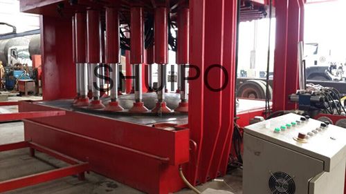 液压缸采用倒吊的方式安装在上平台上,上平台安装导向条,液压缸可在导向条内自由移动,以适应各种封头的形状。液压系统应用比较广泛,其压力大、可操作性好,配件比较容易采购。